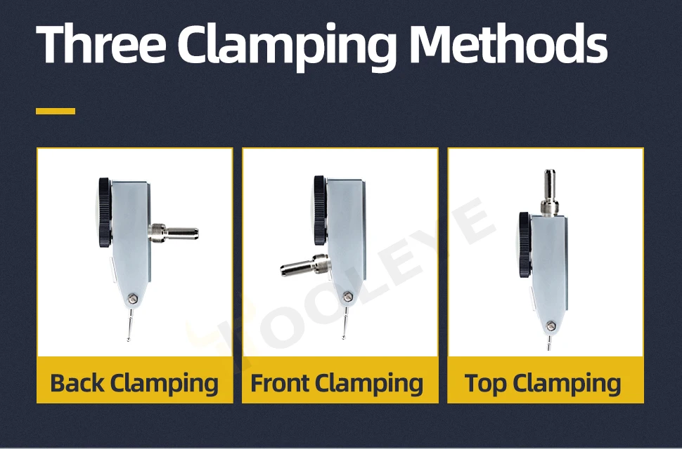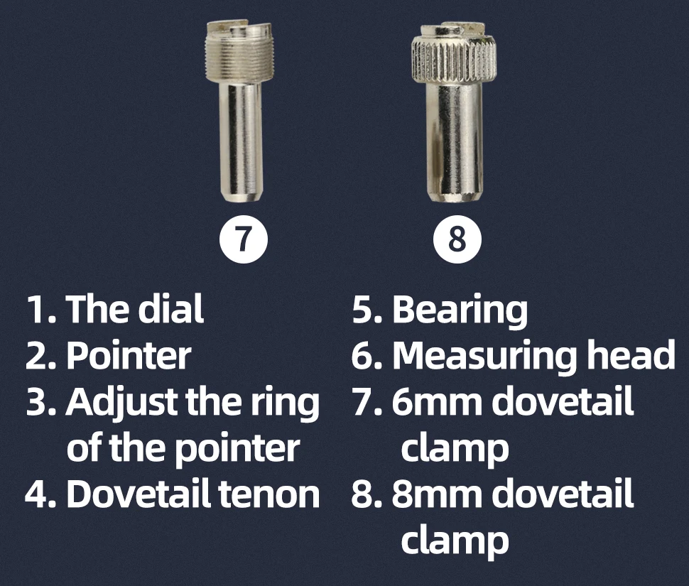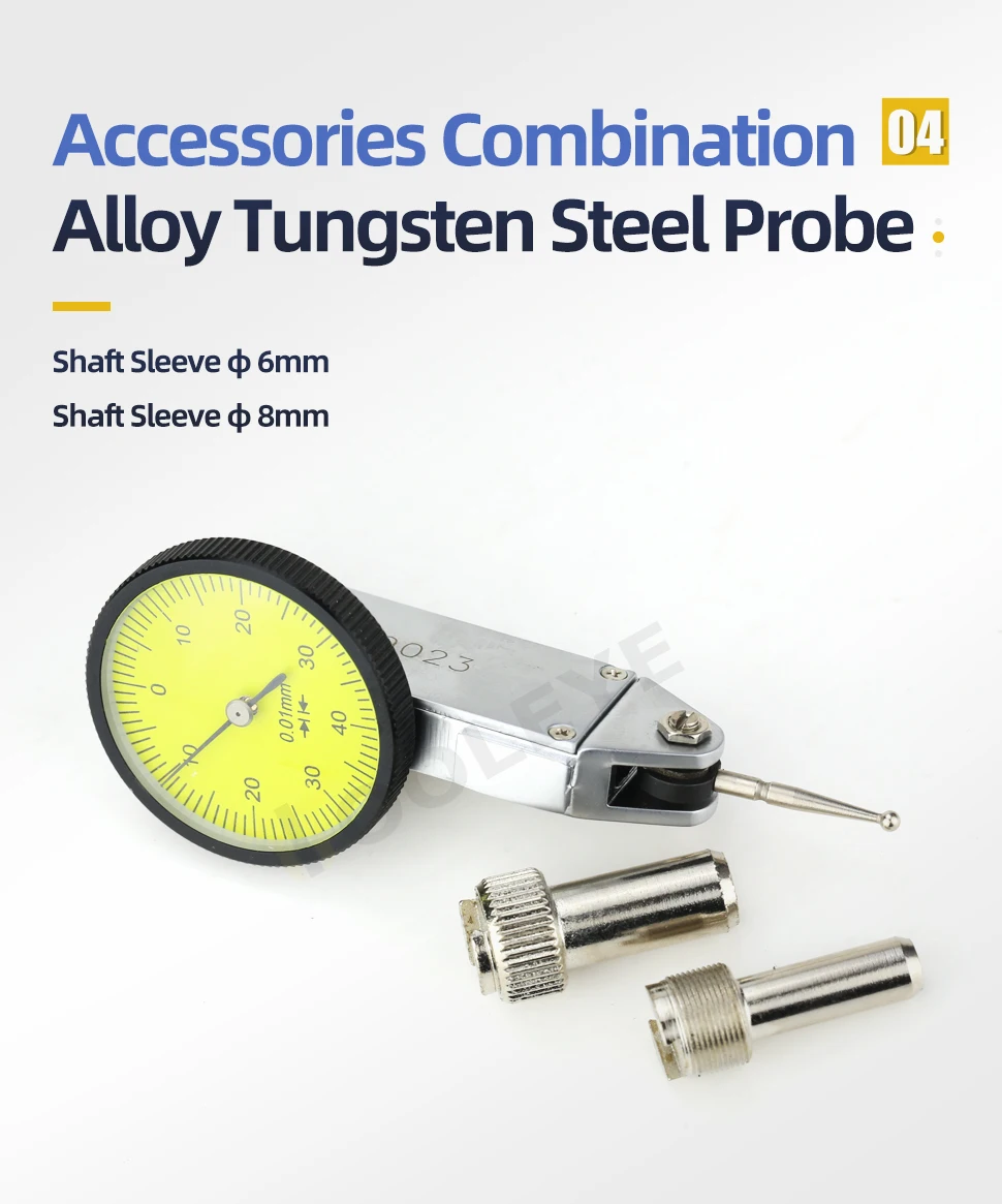 Features: The measuring probe of the lever dial indicator can be adjusted 240° at will. The measuring probe is made of alloy tungsten steel. Accessories combination: shaft sleeve φ6mm, φ8mm.