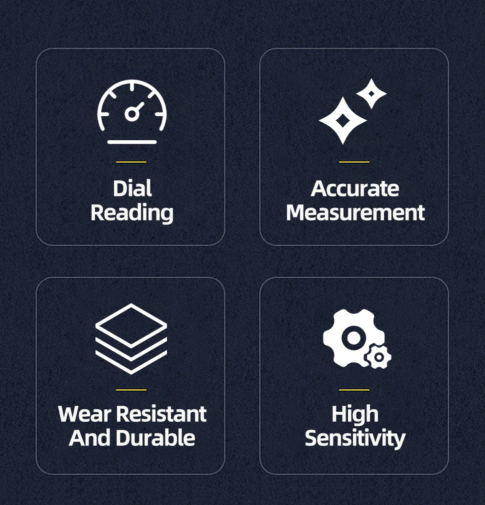 Features: The accuracy of the dial indicator is 0.01mm, which can more accurately measure the concentricity of the main body. The scale is clear, and the reading is intuitive and convenient. High-quality stainless steel measuring probe, rust-proof and wear-resistant.